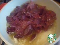 Когда сливочное масло растает добавить нарезанное на крупные куски печень. Обажарить 3 минуты на среднем огне, периодически переворачивая. |