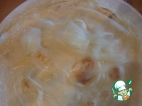 Сверху на грушу кусочки горячей печени и полить соусом из горчицы и масла. Сбрызнуть соков лимона и накрыть второй половиной блина |