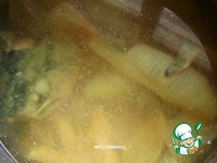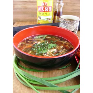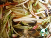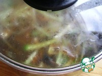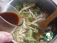 В бульон положить грибы яноки и варить до готовности– минут 15. Затем добавить соевый соус и опустить лук, морковь и редьку. Довести до кипения, размешать. |