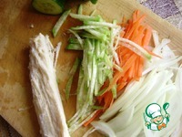 Овощи почистить, промыть и нарезать все тонкой соломкой. |