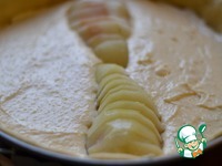 Каждую половинку груши нарезаем на тонкие кусочки, не разделяем их. Выкладываем нарезаные груши на крем. Вот так |