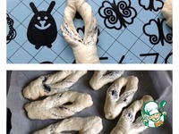 Один конец вывернуть через дырку и расправить середку. Булочки оставить отдохнуть минут на 10-15, затем смазать желтком или молоком, или как я, майонезом. Отправить в духовку при 200*С до готовности. |