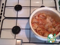 Обжариваем лук, морковь, перец сладкий и свинину, добавляем воду, солим и тушим 30минут. |