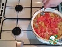 Добавляем лаврушку, чеснок и помидоры и ещё тушим 10минут. |