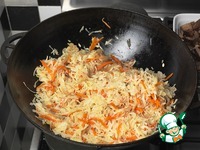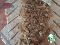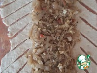 Верхнюю узкую часть положить внахлест на капусту, формируя бортик. Одну полоску теста завернуть на начинку. Следом положить на начинку полоску теста с противоположной стороны. |