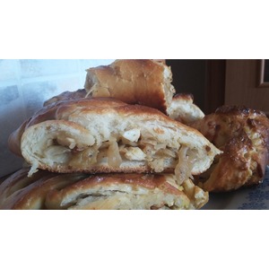 Уложить половину начинки прямо посредине теста. Пройтись ножом, сделав надрезы по краям раскатанного теста, чтобы получились полоски. |