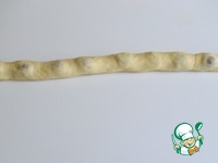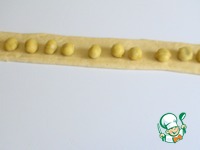На середину полосы по всей длине выложит карамельку. Сверху закрыть краем теста, защипать, сделать второй оборот, снова хорошо защипать, прокатать колбаску по шву. |