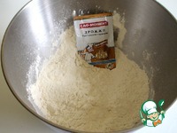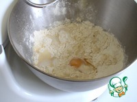 В просеянную муку, втереть дрожжи. Добавить соль, сахар, молоко 230 гр, яйцо, протертый через сито творог Перемешать, оставить на 30 минут, для развития клейковины, это обязательно. |