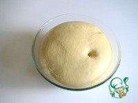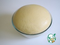Тесто подкатать в шар, выложить в миску, смазанную растительным маслом, затянуть пищевой пленкой. Ставим на расстойку, примерно на час, тесто должно увеличиться в два раза. |