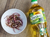Нарезать лук тонкими полукольцами и поместить в заправку, чтобы он немного промариновался. |