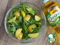 Рукколу и корн смешать и добавить теплый картофель. Можете использовать любой другой микс зелени. |