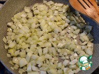 Когда мясо будет готово, приступим к приготовлению соуса. Для этого лук нарезать небольшими кубиками. В сковороде разогреть масло и обжарить лук до прозрачности. |