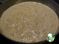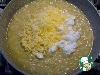 В соус добавить сметану и натертый на крупной терке сыр. Дать сметане с сыром разойтись в соусе, постоянно помешивая в течение 4-5 минут. |