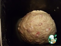Загружаем ингредиенты в х/п согласно инструкции. У меня было не очень солёное сало, и я добавила соль. После замеса получается такой милый колобочек. Я выпекала на основном режиме выпечки. Ждём... |