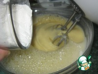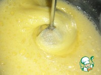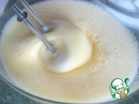 К яичной массе добавляем половину молока и сахар, продлолжая взбивать |