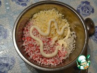 После того, как измельчили все продукты, смешиваем их в миске вместе с майонезом. Должна получиться достаточно густая масса. |