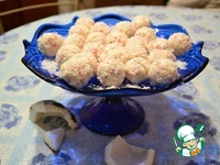 Из полученной массы сделать шарики, размером с абрикос, положив во внутрь очищенный орех, и обвалять их в кокосовой стружке. |