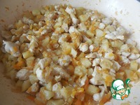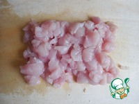 Для начинки: оставшийся лук также измельчить. Куриное филе нарезать на мелкие кусочки. |