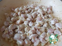 Лук слегка обжарить на растительном масле. Добавить куриное филе и обжарить 2-3 минуты. |