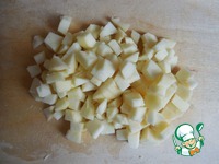 Яблоко очистить от кожуры и семечек и нарезать кубиками (размером примерно как кусочки курицы). |