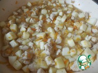 Добавить яблоко в сковороду с курицей и тушить еще 7-8 минут. Яблоко должно стать мягким, но не превратиться в кашу. |