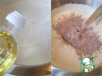 Переключить миксер на самую низкую скорость, добавить во взбитые яйца растительное масло, поочередно, ложка за ложкой. Затем постепенно ввести смешанные и просеянные, все сухие ингредиенты. |