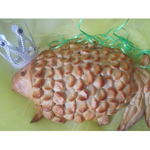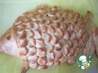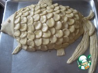Баба прикрепила хвост и плавники, смазала яйцом. |