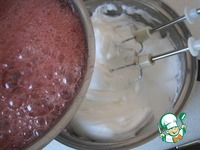 Пока сироп варился муж уже взбил охлажденные белки и я вливаю горячий сироп. |