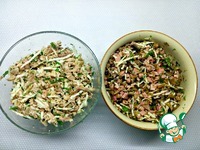 Сверху положить еще один блинчик. На него столовую ложку куриной начинки. |
