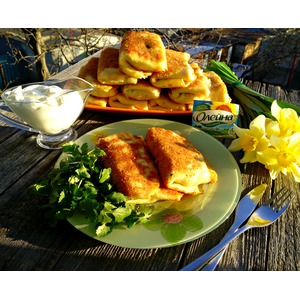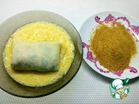Яйца взбить, в отдельную тарелочку насыпать панировочные сухари. Блинный конвертик аккуратно обмакнуть во взбитое яйцо... |