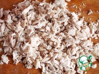 Отварную куриную грудку нарезать на маленькие кусочки. |