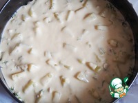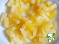 Распределить в форме 1/2 часть теста. Сверху разложить куриное филе с укропом и ананасы. |