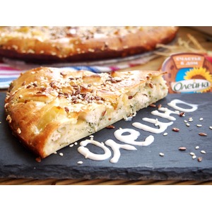 Посыпать кунжутом и семенами льна. Выпекать в духовке, заранее разогретой до 190 градусов, 25 - 30 минут, до румяности. |