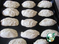 Формуем пирожки, укладываем их на смазанный противень и сверху смазываем яичным белком. Даем пирожкам подойти 10 минут. |