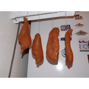 P.S.Cамое сложное в этом - не съесть раньше времени. Cделал три кусочка, повесил без марли на кухне, с местом со сквознячком проблемка, а на балконе сыровато. Этот кусочек провисел 5 дней - маловато однако, я люблю посуше, буду ещё ждать, если раньше не съем ПОЛУЧИЛОСЬ ВКУСНО!!!