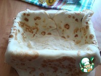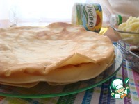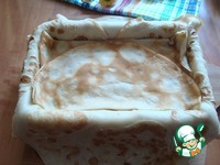Выкладываем 4 блина так, чтобы концы свисали, а они должны свисать так, чтобы потом хорошо закрыли верх пирога и дно, чтобы было застелено. |