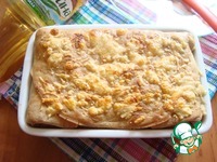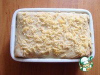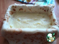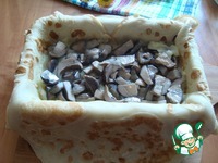 У нас остался пятый блин и вот его мы выкладываем после грибов, примерно посередине заполненной формы. Блин этот я всегда разрезаю пополам и прямыми концами выкладываю по стенкам формы. |