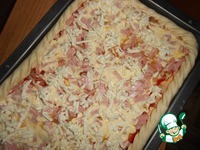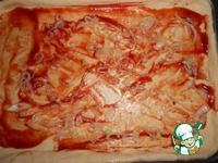 Лук очистить, мелко нарезать и обжарить на растительном масле. Пласт теста смазать кетчупом, выложить лук. |