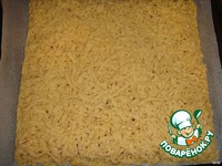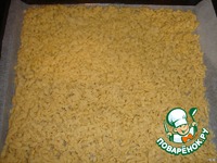 Когда тесто достаточно охладится, натереть на крупной терке на противень 2 части. Утрамбовывать не стоит, просто натрите ровным слоем. |