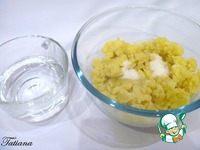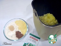 Картофель сварите в кожуре, почистите, разомните вилкой, отмеряйте 170 г. В картофель добавьте соль, сахар, теплую питьевую воду (170 мл), перемешайте. |