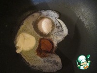 В сковороде или сотейнике растопить сливочное масло, добавить сахар, корицу, карри, перемешать все пряности. |