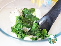 В сухой хороший творог добавить шпинат, немного соли и перца, перемешать. |
