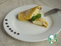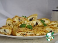 Чтобы начинка равномерно распределилась внутри блинчика, положите ее на край налистника как-бы полумесяцем. А уже потом скручивайте в трубочку. |