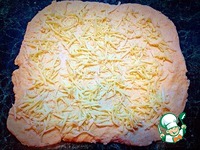 Раскатать тесто в прямоугольный пласт толщиной около 1 см. Посыпать оставшейся половиной сыра. Свернуть тесто вдвое и снова раскатать до толщины около 1 см. |