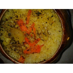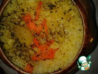 Сверху мяса в каждый горшок выкладываем по половине нарезанного полукольцами лука и слегка поджаренную соломкою морковь. |