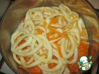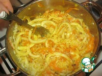 А потом уж и кальмар, Мелко нашинкованный, Жарим после мы морковки В разогретой сковородке, Чтобы стал он золотистый, Лишь минутку - то есть, быстро. |