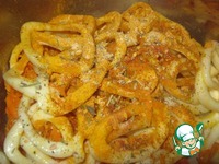 Все, кальмар со сковородки Перекладываем в рис, Что на стадии готовки Уже в положеньи риз. И морковь кладем туда же, Специи добавим также. |