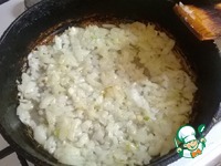 Сначала готовим зажарку: режем лук, обжариваем с маслом, добавляем соль, перец и специи по вкусу. Затем трем морковку и добавляем ее к луку. |