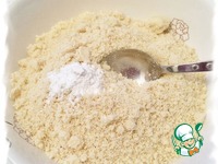 Лопаточкой, движениями снизу вверх, вмешать миндальную муку частями. |