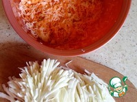 Вареное мясо (колбасу) порезать мелкими кусочками. У меня в этот раз было белое мясо запеченной на соли курицы, разобранное на волокна руками. |